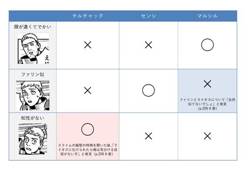 自分と同じ考察が見当たらなかったので書いた。表で色を付けているところが考察で、ほかは消去法で埋めた。 1.ライオスのシェイプシフター みんなのライオス像がむちゃくちゃすぎて笑える。 2.チルチャックのシェイプシフター センシはチルチャックのこ…